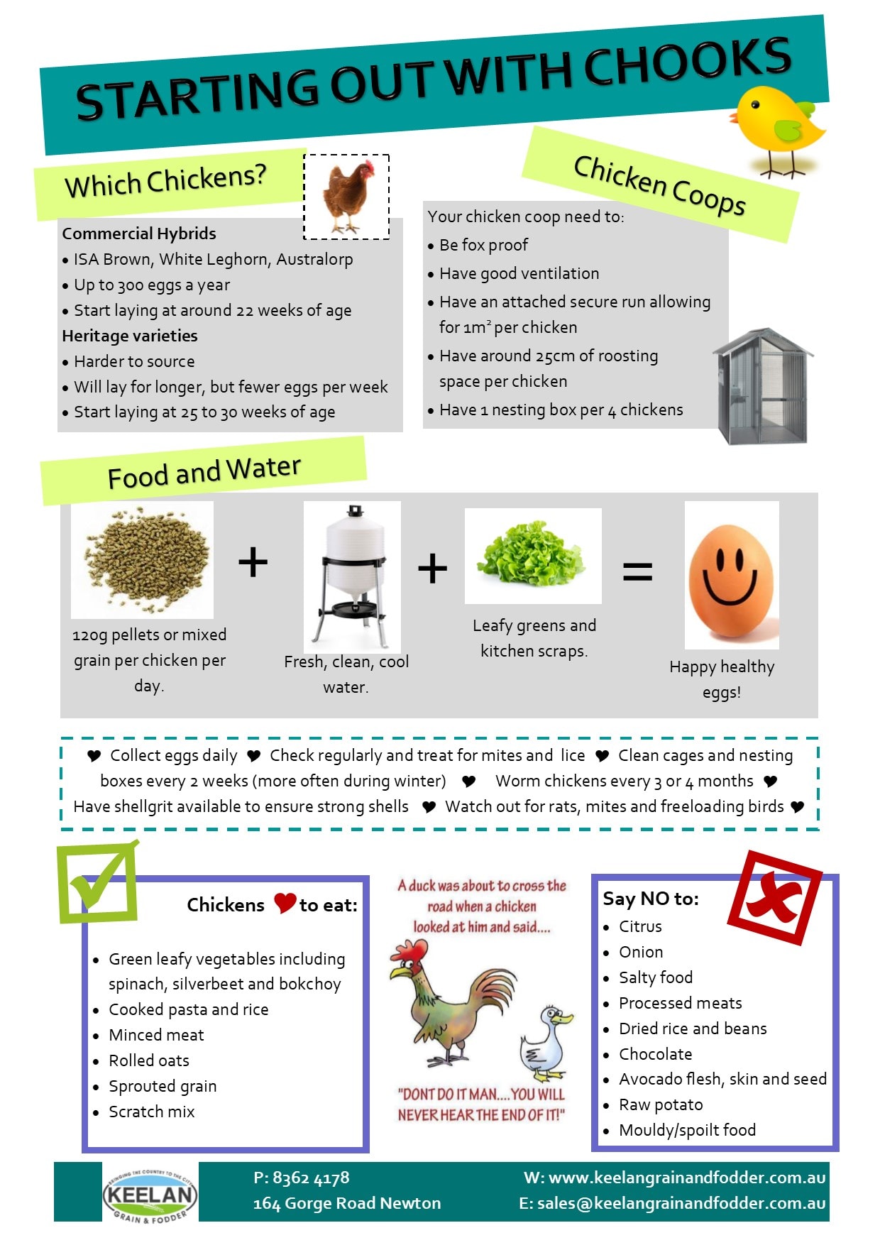 We now have a fact sheet for people wanting to start with chickens.  The fact sheet outlines the basics of everything you need to get started with chooks.  Off course we are always available to discuss your needs in store or over the phone too.